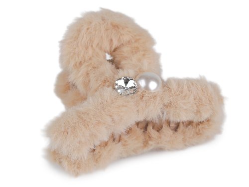 Skřipec do vlasů kožešinový s perlou a broušeným kamenem - béžová