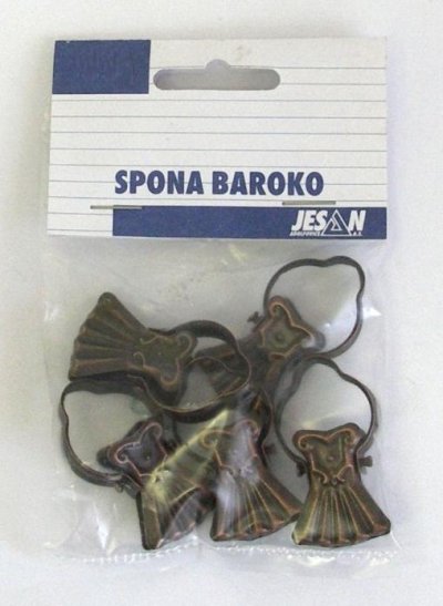 Kovový lakovaný skřipec na záclony. Tvar baroko, hnědá barva. Balení po 20 ks NEROZBALUJEME. Český výrobce. EAN 8595047811785