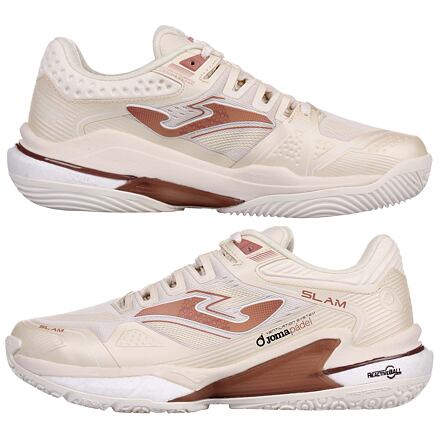 Nový Slam model značky JOMA na padel a tvrdé povrchy je určený pro pravidelné a náročné hráčky. I nadále si zachovává maximální úroveň přilnavosti, ochrany, stability a odpružení. Svršek je vyrobený z prodyšné síťoviny, která má elegantní žakárovou úpravu s VTS perforací. Tato technologie umožňuje cirkulaci vzduchu a zajišťuje tak správnou ventilaci. Díky použitým technologiím SPORTECH a PROTECTION je bota lehká, flexibilní a odolná. Mezipodešev má nový tvar, i když stále obsahuje technologii DUAL REACTIVE, složenou z horního phylonu a spodního REACTIVE BALL. Dosahuje dokonalé rovnováhy mezi odpružením, reaktivitou a stabilitou, kterou posiluje díl STABILIS. Všestranná podešev z pryže DURABILITY, tvořená malými kruhovými výstupky pro zlepšení odolnosti na tvrdém povrchu. Usnadňuje skluzy během rychlé hry. Zahrnuje geometrickou strukturu ROTATION pro usnadnění otáčení.