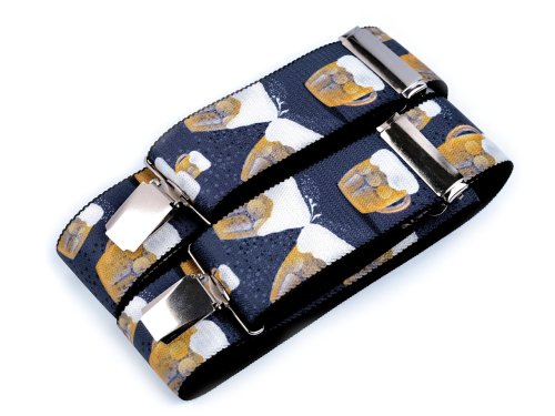 Kšandy s potiskem piva potěší především muže. Kšandy bývají nedílnou a zároveň praktickou součástí jejich oblečení. Jsou kvalitní české výroby, elastický materiál umožňuje pohodlné nošení. Zadní vsadka z eko kůže jim dodává stylový vzhled. Ke kalhotám se upevňují na tři žabky - dvě vpředu a jednu vzadu.