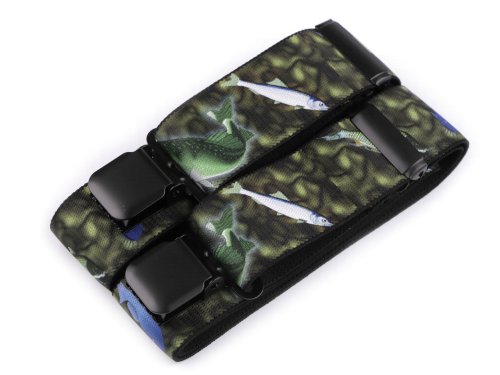 Kšandy s rybím potiskem potěší všechny rybáře. Kšandy bývají nedílnou a zároveň praktickou součástí jejich oblečení. Jsou kvalitní české výroby, elastický materiál umožňuje pohodlné nošení. Zadní vsadka z eko kůže jim dodává stylový vzhled. Ke kalhotám se upevňují na tři žabky - dvě vpředu a jednu vzadu.
