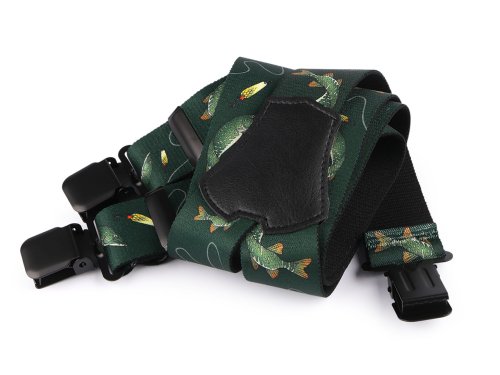 Kšandy s rybím potiskem potěší všechny rybáře. Kšandy bývají nedílnou a zároveň praktickou součástí jejich oblečení. Jsou kvalitní české výroby, elastický materiál umožňuje pohodlné nošení. Zadní vsadka z eko kůže jim dodává stylový vzhled. Ke kalhotám se upevňují na tři žabky - dvě vpředu a jednu vzadu.