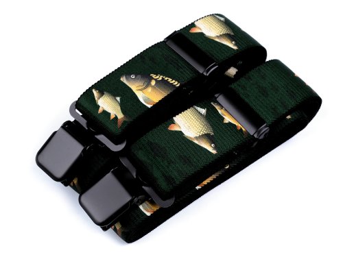 Kšandy s rybím potiskem potěší všechny rybáře. Kšandy bývají nedílnou a zároveň praktickou součástí jejich oblečení. Jsou kvalitní české výroby, elastický materiál umožňuje pohodlné nošení. Zadní vsadka z eko kůže jim dodává stylový vzhled. Ke kalhotám se upevňují na tři žabky - dvě vpředu a jednu vzadu.