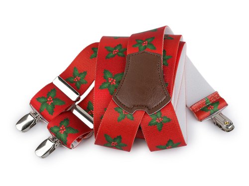 Kšandy s potiskem vánočních motivů potěší všechny milovníky adventních svátků. Užijete si s nimi spoustu legrace při rodinném focení, na vánoční párty i na silvestra. Jsou kvalitní české výroby, elastický materiál umožňuje pohodlné nošení. Zadní vsadka z eko kůže jim dodává stylový vzhled. Ke kalhotám se upevňují na tři žabky - dvě vpředu a jednu vzadu. [Žabky mají uvnitř gumový povrch, který zabrání ničení kalhot.]