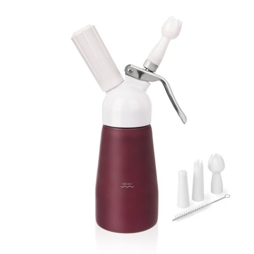 Slouží k přípravě šlehačky potřebujete buď výměnné nebo jednorázové šlehačkové bombičky s náplní N2O. Barva vínová / bílá. Materiál hliník, plast ,silikonové těsnění. Objem 0.4 litru, pojme 0.1 až 0.15 litru šlehačky. Průměr 8 cm, výška 21 cm. Nedoporučuje se používat přísady jako ztužovač šlehačky, krystalový cukr, který může způsobit hrudkování. EAN 8592381164287