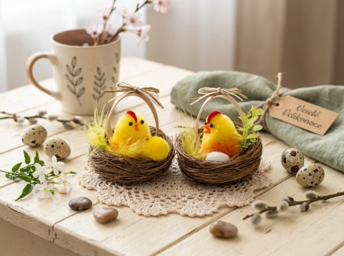 Upozornění: Dekorace slepička s kuřátkem v hnízdě může obsahovat malé části, které by mohly být vdechnuty nebo spolknuty malými dětmi. Není určeno pro děti do 3 let. Hrozí nebezpečí udušení.