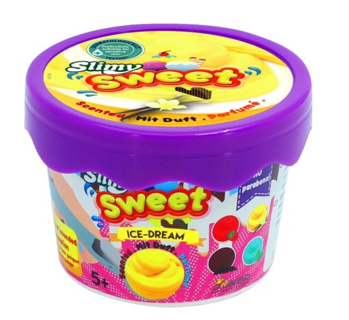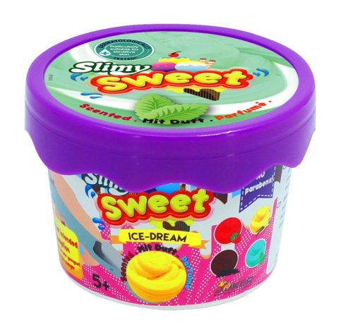 Slimy Ice-Dream je zábavná a bezpečná hračka ve formě slizu s vůní, která je vhodná pro děti od pěti let. Tento produkt je balen do praktických plastových kelímků s fialovým víčkem, které zároveň chrání obsah před vysycháním a usnadňuje skladování. Každý kelímek obsahuje 100 gramů slizu, který je dostupný ve čtyřech různých barevných variantách a vůních připomínajících oblíbené ledové krémy – například žlutý vanilkový, červený jahodový, hnědý čokoládový a světle zelený mátový.