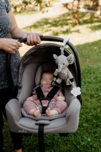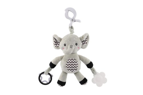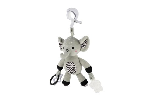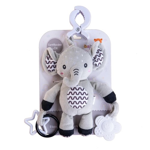 Roztomilý plyšový sloník je ideální hračka pro miminka již od narození. Díky praktickému závěsnému klipu jej snadno upevníte na kočárek, postýlku, autosedačku nebo hrazdičku. Miminko bude mít svého hebkého kamaráda vždy u sebe – doma i na cestách. Sloník je vyroben z měkkého, na dotek velmi příjemného plyše, který vybízí k mazlení. V tělíčku má ukryté jemné chrastítko, které podporuje sluchový rozvoj a přirozeně upoutává dětskou pozornost. Na koncích ručiček jsou připevněny bezpečné plastové tvary (hvězdička a kytička), které rozvíjejí hmat, jemnou motoriku a mohou sloužit i jako hračka na žužlání. Má jemně šustící uši. Hračka je certifikována v ČR, takže splňuje vysoké bezpečnostní standardy pro nejmenší děti.