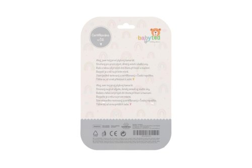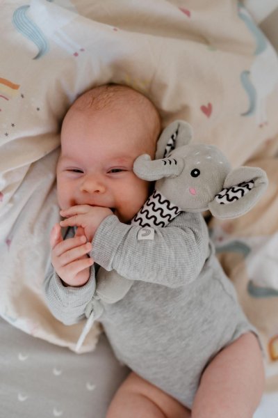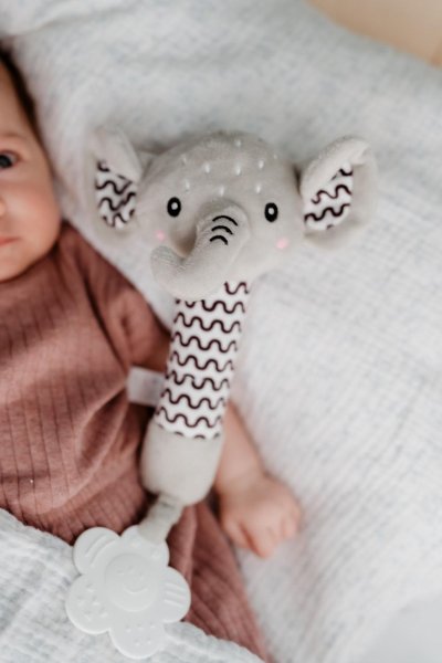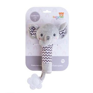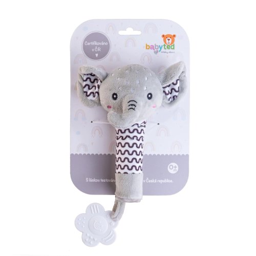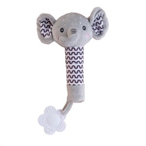 Roztomilý plyšový sloník je ideální první hračka pro miminka již od narození. Měkké tělo sloníka se lehce drží v malých ručičkách a při stisku vydává jemný pískací zvuk, který podporuje sluchový rozvoj a přirozeně upoutává pozornost miminka. Na konci držátka je umístěno měkké plastové kousátko ve tvaru kytičky, které pomáhá ulevit citlivým dásním při prořezávání zoubků. Kontrastní vzory na tělíčku a ouškách podporují vizuální vnímání dítěte. Sloník je vyroben z hebkého a bezpečného plyše, který je vhodný pro nejmenší děti. Certifikováno v ČR, což zaručuje splnění přísných bezpečnostních norem.