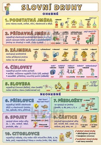 Přehledně zpracované slovní druhy včetně příkladů a názorných ilustrací. Obsahuje mluvnické významy podstatných jmen, vzory, mluvnické významy sloves a příklady na časování sloves. Názorné ilustrace od Petra Kopla.