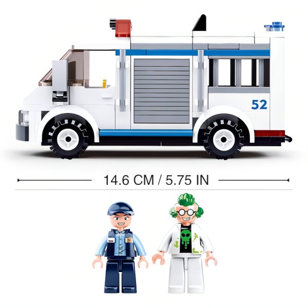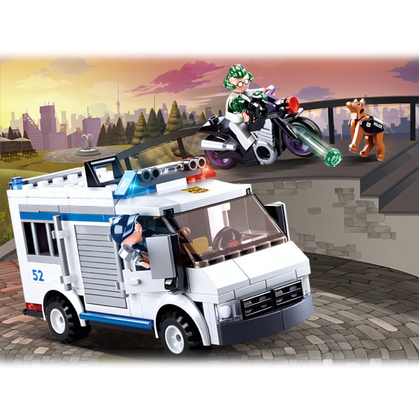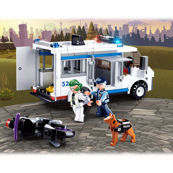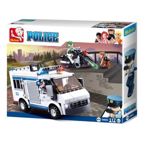 z pistole je možné střílet vůz má zadní i boční dveře otevírací pes může hýbat hlavou délka vozu: 14,6 cm lze stavět podle podrobného návodu nebo dle vlastní fantazie kostky do sebe snadno a přesně zapadají stavebnice Sluban jsou kompatibilní s kostkami z dalších stavebnic
