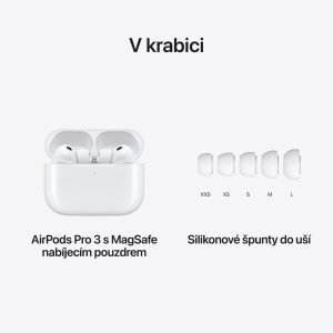 Apple AirPods Pro 3 posouvají laťku poslechu na zcela novou úroveň. Nabízí až 2× účinnější potlačení hluku, snímání tepové frekvence a vylepšený tvar pro dokonalé usazení v uchu. Prémiová bezdrátová sluchátka navržená pro náročné posluchače i sportovce přinášejí špičkový zvuk, pokročilé funkce pro zdraví sluchu a výdrž až 8 hodin na jedno nabití.
