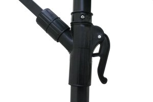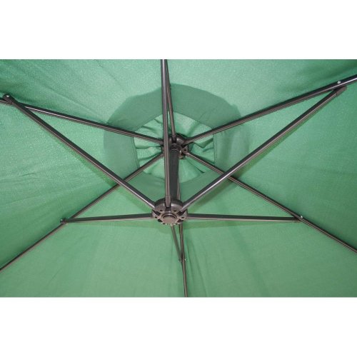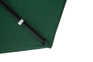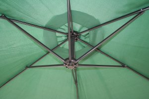 Závěsný slunečník průměr 300 cm má 6 ocelových žeber 12 x 18 mm, je vyrobený z polyesteru 160 g / m2. Pevná ocelová tyč má průměr 4,8 cm. Stojan, který je součástí výrobku je možno zatížit betonovými dlaždicemi pro zvýšení celkové stability. Otevírání slunečníku se provádí kličkou. Navíjecí systém má plastové pouzdro s kovovým navíjecím mechanismem - kovová klička, kovová hřídel a kovový pastorek s kovovou závlačkou. Barva tmavě zelená.