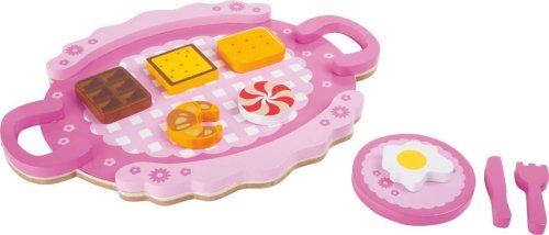 Snídaňová souprava v růžových tónech je vyrobená ze dřeva. Sada obsahuje podnos, talířek, vidličku s nožem a obvyklé snídaňové dobroty jakou jsou například croissant či vajíčko.