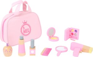 Zrcadlo, zrcadlo, kdo je nejkrásnější… v tomto dětském pokoji? Soutěž krásy může začít s touto roztomilou kosmetickou taštičkou plnou růžových dřevěných doplňků. Fén, hřeben, lak na nehty i voňavka, pudr i oční stíny jsou tím, co by mladá parádnice měla mít. Lahvičky z lakovaného dřeva se úhledně vejdou do přenosné tašky. Hlavní vlastnosti: obsahuje taštičku a 8 ks příslušenstvírozvíjí hraní rolí