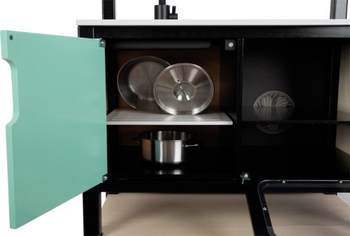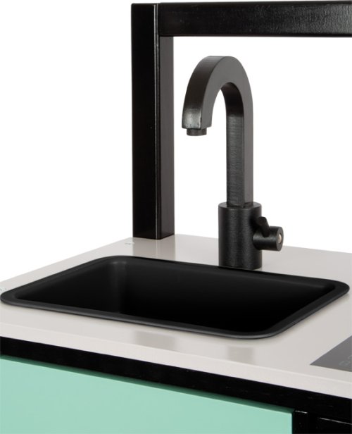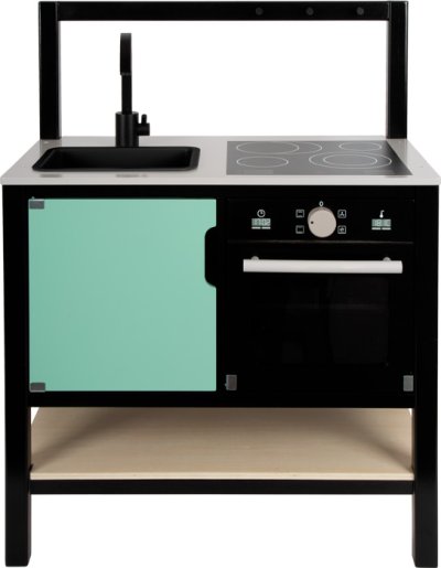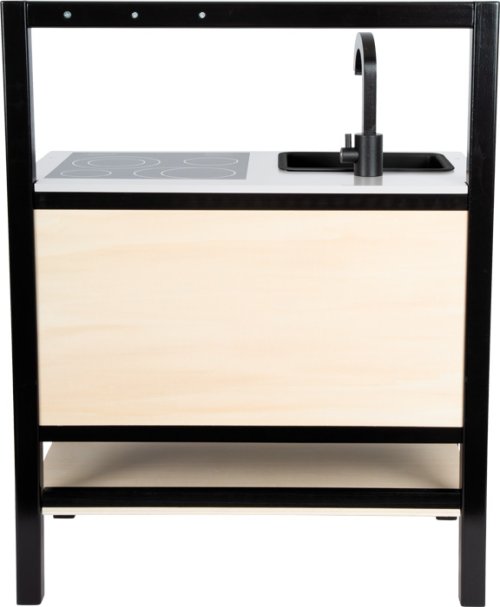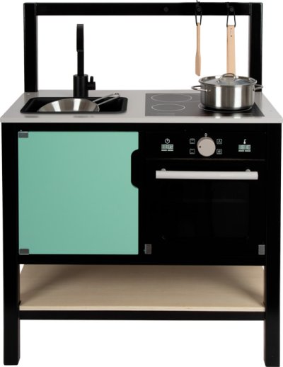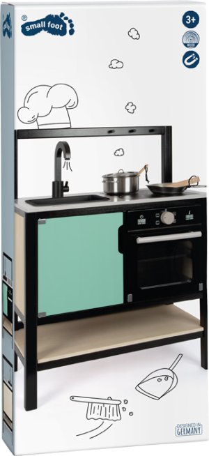 Kuchyně pro malé špičkové kuchaře. Díky svému modernímu modulárnímu vzhledu kuchyně, který je zdůrazněn stylovou konstrukcí černého rámu, je tato dřevěná kuchyňka na hraní absolutním poutačem. Chytré detaily dělají kuchyňku ještě zajímavější - vodovodní kohoutek s pákou na regulaci teploty vody, odnímatelný plastový dřez, trouba s vyjímatelným plechem, cvakající knoflíky spolu s ilustrací na spotřebičích vytvářejí mimořádně autentický zážitek. Součástí je pánev, hrnec s poklicí, lopatka a grilovací kleště. Takže je tato kuchyně ihned připravena ke hře! Obzvláště praktická a funkční je skřínka pod pracovní plochou, také háčky na zavěšení kuchyňského příslušenství. Takže všechny kuchyňské náčiní lze po hře úhledně uspořádat a mít je po ruce. Chytrým detailem je dno police ve skříni, které lze také použít jako grilovací rošt pro troubu v kuchyňce. Levou stranu skříně lze flexibilně využít jako ledničku nebo myčku. Díky lehkému rámu se dřevěná kuchyňka také snadno přemisťuje, takže místo hry lze měnit. Je to vizuálně přitažlivá, moderní dětská kuchyňka, která nabízí vše, co mladí špičkoví kuchaři potřebují k naplnění své fantazie. Hlavní vlastnosti: navržena tak, aby děti podporovala v dlouhotrvající představivé hřerůzné odkládací a úložné prostorybaterie nejsou součástí balenípodporuje hraní rolí a sociální dovednosti