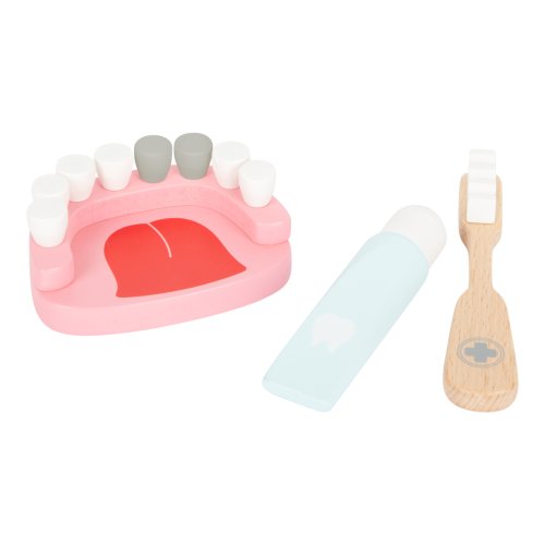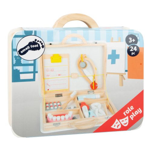 Zubní kazy nebudou mít šanci! Kufřík na zámek udělá dojem svými dřevěnými doplňky s pěkným designem. Dětská stříkačka, vrtačka, kartáček, sada zubů, zubní pasty a kleští, tato dřevěná dětská sada pro zubaře má vše! Dva šedé zuby děti naučí důležitosti zubní hygieny. S teploměrem, balzámem, pinzetou, tabletkami a poznámkovým blokem se kufřík hodí také ke hře na lékaře. Perfektní hračka, která děti připraví na první návštěvu u zubaře nebo lékaře. Děti si mohou zahrát na lékaře, tato hra podporuje kreativitu a dodá dětem odvahu. Všechny doplňky se pohodlně vejdou do kufříku. Otevřete si vlastní praxi! Hlavní vlastnosti Dřevěný kufřík na zámekTeploměr, balzám, injekční stříkačka, pinzeta, tablety, model zubůPěkný dětský design