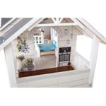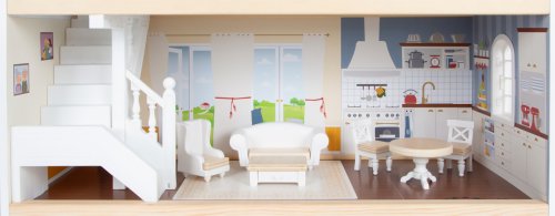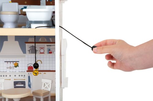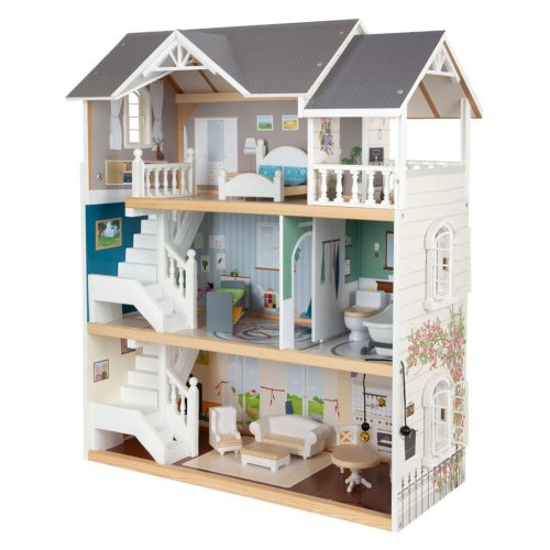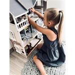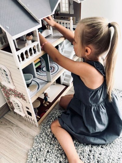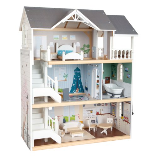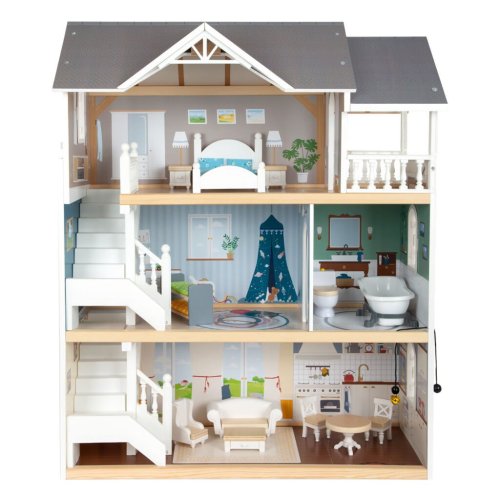 Velký, stabilní dřevěný domeček pro panenky zaujme svým detailním designem jak uvnitř, tak z vnějšku. Díky otevřené přední straně je ideální pro společnou hru více dětí, které si mohou snadno hrát zároveň.Domeček má tři podlaží propojená schodištěm a nabízí celkem pět prostorných místností – jídelnu s obývacím pokojem, dětský pokoj, koupelnu, ložnici a lodžii, které poskytují dostatek prostoru pro kreativní hraní a vytváření vlastních příběhů.Součástí je 12 kusů nábytku a různé doplňky s dřevěnými i plastovými detaily, které zajišťují realistickou a zábavnou hru. Nechybí ani schody, posuvné dveře, otevíratelná okna, noční stolky se zásuvkami a dokonce i funkční zvonek, který oznamuje příchod návštěvy – všechny tyto prvky dodávají domečku autentičnost a podporují dětskou představivost.Výrobek vyžaduje montáž, která je snadná díky detailnímu návodu k sestavení. Tento krásný domeček se tak stane nejen oblíbeným herním centrem, ale i působivým doplňkem dětského pokoje. Hlavní vlastnosti: díky světlé vnější fasádě a modernímu designu se vila hodí do jakéhokoliv dětského či obývacího pokojedostatečně velký pro společnou hru více dětífunkční zvonek a prvky nábytkuobsahuje 12 ks nábytku s doplňkyvhodné pro panenky do velikosti 12 cm Ocenění hračky: Top 10 Spielzeug Nominiert 2021