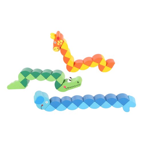 S těmito zvířátky zažijí Vaše děti pravou divočinu! Články jejich těl mohou rozpustile otáčet a klikatit, přitom zábavnou formou cvičit zručnost a soustředění. Každá z variant je vyvedena v jiné, poutavé barvě, kterou zpestří a rozveselí stolek, či poličku v dětském pokojíčku. Tělo hračky je vyrobeno z odolného dřeva spojeného gumičkou a díky své velikosti může děti snadno provázet na cestách. Hlavní vlastnosti:3 různé variantyatraktivní a odolné dřevěné zpracování