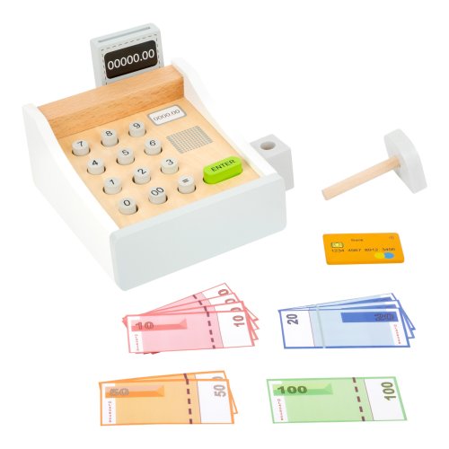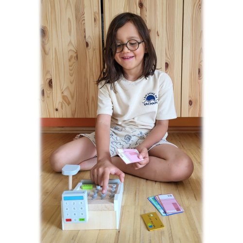 Peníze se jen sypou! Tato krásná dřevěná pokladna patří do každé dobře organizované dětské prodejny. Hraní s touto hračkou pomáhá dětem pochopit ceny zboží a manipulaci s penězi. Součásti jsou bankovky na hraní a dřevěné kreditní karty, které se pohodlně vejdou do spodní zásuvky. Cena zakoupeného zboží může být zadána na klávesnici. Kdo je další na řadě? Hlavní vlastnosti: dřevěná pokladna včetně skeneru, čtečky karet, hracích peněz a dřevěné kreditní kartyučí děti poznávat peněžní částky a cenyideální doplněk pro obchod na hranípodporuje aktivní hraní rolí a rozvoj sociálních dovedností dětí při hře