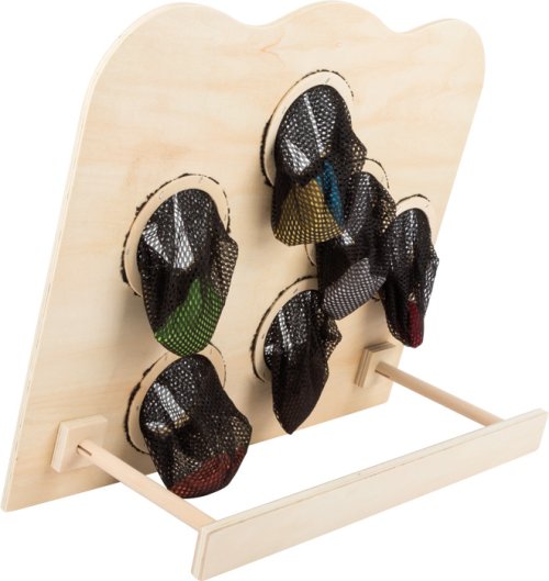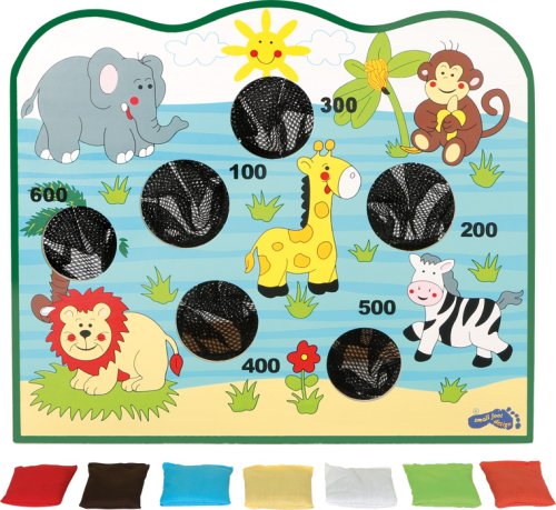 Barevná hra na házení do otvorů se síťkou malými barevnými pytlíčky. Otvory se liší velikostí a čím menší je otvor, tím těžší je se trefit. Ale počet bodů motivuje - zkuste to! Tato hra zabírá málo místa a je ideální pro hraní v místnosti! Hlavní vlastnosti: procvičuje koordinaci ruka-oko a motoriku
