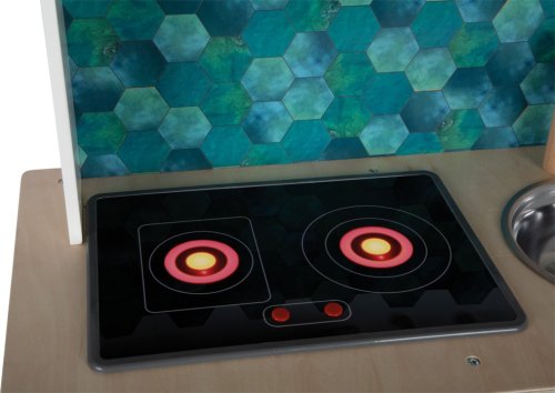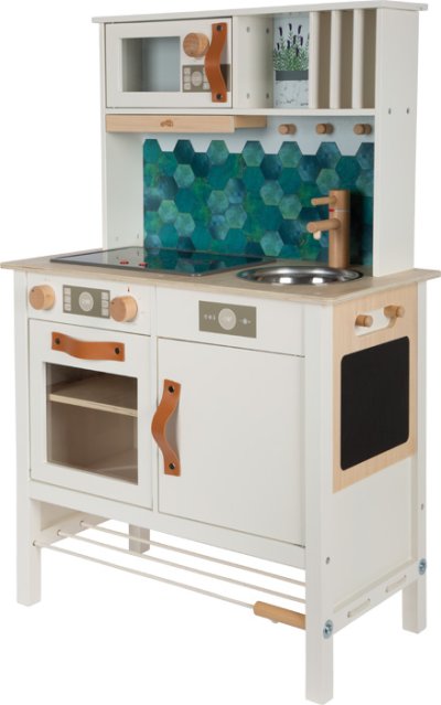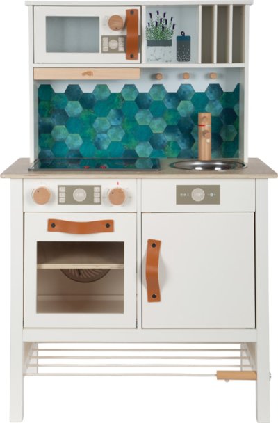 Video je pouze ilustrační. Moderní dětská kuchyňka s robustní konstrukcí v trendy bílé barvě v kombinaci se stylovými koženými madly v koňakové barvě. Okamžitě připravena k hraní s přiloženým hrncem s poklicí, pánví a kovovým kuchyňským náčiním. Dodává se s kovovým dřezem a otočnými knoflíky, které vydávají zvuk. Součástí je elektronická varná deska se světlem a zvukem a zatahovací digestoří se světelným symbolem. Vyjímatelný pekáč lze použít také jako tabuli na kreslení. Povrchy v chladničce a troubě jsou potištěné kuchyňskými detaily pro větší zábavu při hraní. Oboustranný zadní panel s vysoce kvalitním potiskem ve vzhledu dlaždic nebo jednoduché bílé barvě. Lze perfektně doplnit dalšími výrobky a kuchyňskými spotřebiči z kolekce Tasty. Hlavní vlastnosti: kovové doplňky a příslušenstvífunční prvky jako cvakající knoflíky, varná deska s efektem světla a zvukunový moderní designnapájení - 2xAA baterie (nejsou sočástí balení)možné doplnit produkty z kolekce Tasty