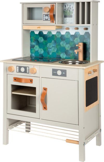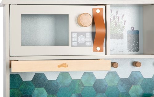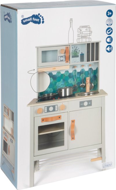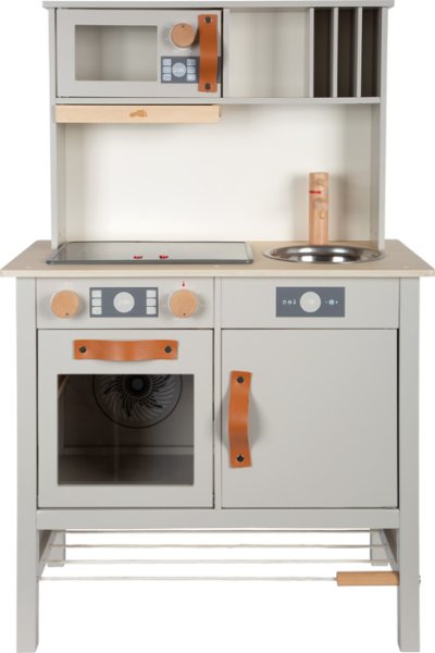 Video je pouze ilustrační. Moderní dětská kuchyňka s robustní konstrukcí v trendy šedé barvě v kombinaci se stylovými koženými madly v koňakové barvě. Okamžitě připravena k hraní s přiloženým hrncem s poklicí, pánví a kovovým kuchyňským náčiním. Dodává se s kovovým dřezem a otočnými knoflíky, které vydávají zvuk. Součástí je elektronická varná deska se světlem a zvukem a zatahovací digestoří se světelným symbolem. Vyjímatelný pekáč lze použít také jako tabuli na kreslení. Povrchy v chladničce a troubě jsou potištěné kuchyňskými detaily pro větší zábavu při hraní. Oboustranný zadní panel s vysoce kvalitním potiskem ve vzhledu dlaždic nebo jednoduché šedé barvě. Lze perfektně doplnit dalšími výrobky a kuchyňskými spotřebiči z kolekce Tasty. Hlavní vlastnosti: kovové doplňky a příslušenstvífunční prvky jako cvakající knoflíky, varná deska s efektem světla a zvukunový moderní designnapájení - 2xAA baterie (nejsou sočástí balení)možné doplnit produkty z kolekce Tasty