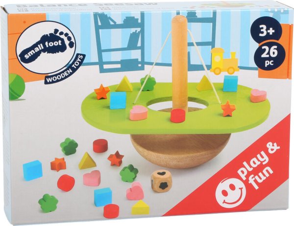 Small Foot Dřevěná motorická hračka Vyvažování balancující houpačka je neobyčejná hra co vás okamžitě pohltí svými jedinečnými výzvami, které z vás učiní mistra rovnováhy. Oddejte se hře, kde každý váš tah je krokem k dokonalé harmonii! Nejenže je tato hračka krásně vyrobena z kvalitního dřeva, ale také se stane vaším společníkem ve světě koncentrace a strategie. S 26 pestrobarevnými dílky a jednou hrací kostkou se Small Foot stává nekonečným dobrodružstvím, kde je každá hra zcela odlišná. Váš malý stratég se naučí rychle přemýšlet, pečlivě plánovat a rozvíjet svou jemnou motoriku, trpělivost a zároveň mu hra přinese pocit úspěchu, zatímco celá rodina bude napjatě sledovat, zda se houpačka udrží v rovnováze! V tomto odolném provedení najdete dokonalého společníka pro dlouhé večery plné smíchu a učení. Kdo by nechtěl být svědkem, jak se jeho dítě učí skrze hru a zábavu? Připojte se k rodinám, které již objevily kouzlo Small Foot Dřevěné motorické hračky a učinily z každého deštivého odpoledne dobrodružství plné rovnováhy a smíchu. Zažijte, jak se vaše domácnost promění ve školu zábavy, kde každý může být vítězem. Jde o zážitek, který posílí mysl i prsty vašeho malého génia! Hlavní vlastnosti: základna, 26 herních dílků a 1 hrací kostkatrénuje koncentraci, trpělivost a jemnou motorikuodolné provedenívhodné od 3 let