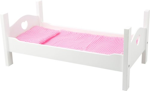 V téhle postýlce se panence či plyšákovi bude spát sladce! Moderní dřevěná postýlka v bílé barvě s detaily srdíček v čelech. Součástí balení je polštář, deka a prostěradlo. Ideální doplněk k sadě nábytku pro panenky. Hlavní vlastnosti: pro panenky do velikosti 45 cmvčetně ložního prádla
