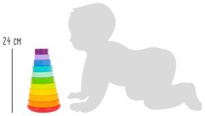 Dřevěná skládací věž podporující vývoj motorických schopností dítěte. Dřevěné kroužky se navlékají na tyčku od největšího k nejmenšímu. Barevné disky musí být nasazeny nejen ve správném pořadí, ale musí být také otočeny do správné polohy. Jen tak se budou mezery v nich shodovat s polohou malých kolíků na tyčce. Tímto úkolem trénují děti jemnou motoriku, trpělivost v řešení složitějších zadání, v neposlední řadě také chápání barev a tvarů. Spodní část hračky je zaoblená. Vhodné pro děti od 12 měsíců.