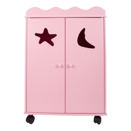 Lakovaná skříňka na kolečkách, se spoustou místa pro každý kousek z šatníku vašich panenek. Levá strana se skládá ze dvou poliček, zatímco pravá z prostoru pro zavěšení šatů. Na dveřích se nalézají dva motivy, hvězda a měsíc, jenž činí tuto skříňku ještě rozkošnější! Hlavní vlastnosti: prostorná dřevěná skříňšatní tyč s poličkamidvířka s magnetickým zavíráním