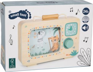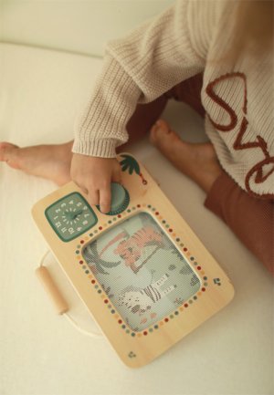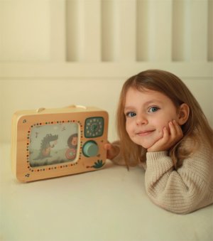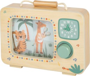 Tato kouzelná hudební skříňka ve tvaru televize vyrobená ze 100% certifikovaného dřeva FSC® přináší dětem radost z hudby, pohybu i objevování. Po otočení knoflíku se barevný obrázek safari zvířátek rozpohybuje a zazní jemná melodie, doprovázená příjemným cvakavým zvukem otočného knoflíku.V hlavní roli je veselý orchestr zvířátek ze safari, který ožívá při každém otočení. Díky praktické rukojeti si mohou děti hrací skříňku snadno vzít kamkoli s sebou. Na přední straně se nachází hodiny s potištěným ciferníkem a pohyblivými ručičkami, které lákají k prvním hrám s časem. Hračka rozvíjí jemnou motoriku, koordinace ruka-oko, sluchové i zrakové vnímání a podporuje představivost. Perfektně ladí s ostatními produkty z oblíbené kolekce Safari, společně tvoří harmonický svět plný hudby a dobrodružství. Hlavní vlastnosti: vyrobena ze 100% certifikovaného dřeva FSC® ve tvaru televize, originální a dekorativní doplněk dětského pokoje pohyblivý obrázek safari zvířátek otočný knoflík s jemným cvakavým zvukem praktická rukojeť umožňuje snadné přenášení kamkoli potištěné hodiny s pohyblivými ručičkami rozvíjí jemnou motoriku, koordinaci, zrakové a sluchové vnímání Značka a certifikát FSC® (Forest Stewardship Council) zaručuje, že dřevo, ze kterého byl produkt vyroben, nebylo vytěženo nelegálně a pochází z lesů obhospodařovaných šetrným či přírodě blízkým způsobem, ve kterém jsou dodržovány přísné environmentální a sociální požadavky. Značka FSC® na výrobku znamená, že svým nákupem pomáháte chránit lesy a podporujete šetrné, odpovědné či přírodě blízké hospodaření, díky kterému jsou naše lesy stabilnější, zdravější, mají přirozenou druhovou skladbu a lépe odolávají negativním následkům klimatických změn.