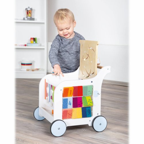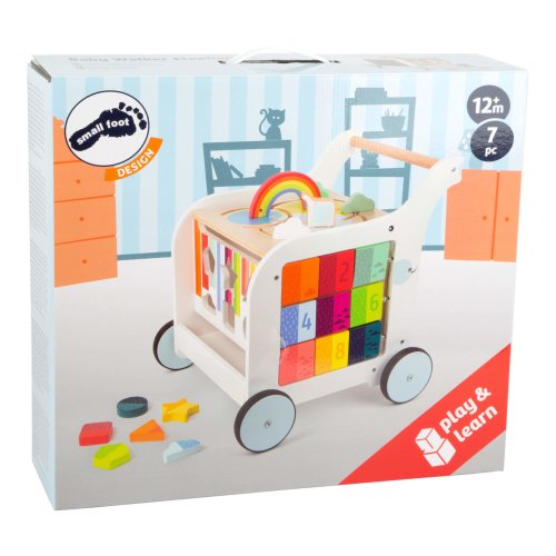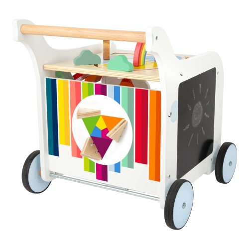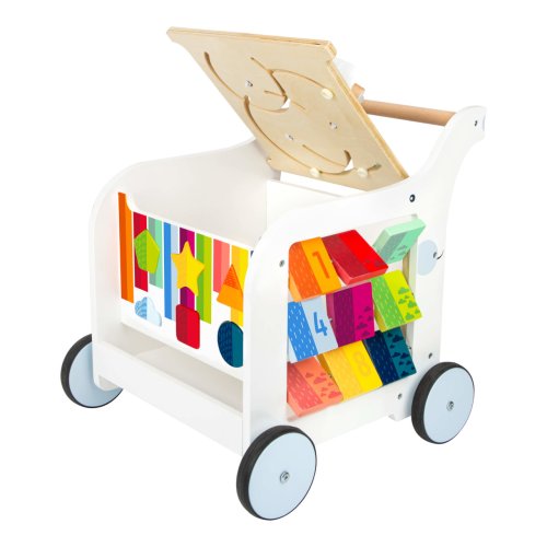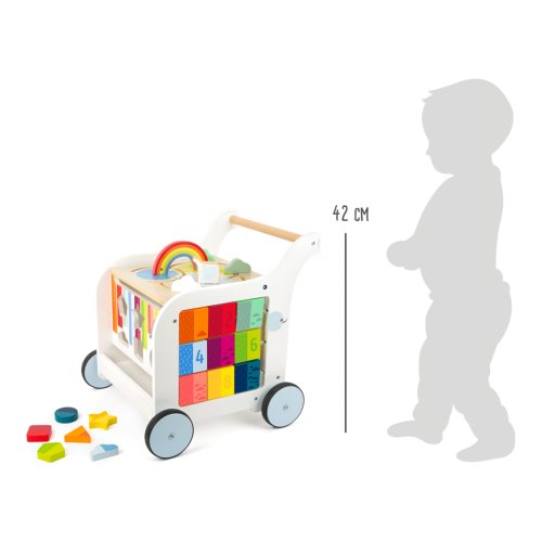 Chodítko ve tvaru slona je multifunkčním doplnkěm pro hru i výuku, přináší zábavu na všech svých pěti stranách! Děti se mohou zabavit duhovým labyrintem, vkládačkou s různými tvary, kreslením na tabulku, nebo otáčením a odklápěním různobarevných prvků. Svrchní desku s labyrintem lze odklápět, je vybavená výřezy bránícími skřípnutí dětských prstů. Odklopením odhalíte objemný úložný prostor na hračky, nebo oblíbeného plyšáka. Kola vozítka jsou opatřena pogumováním, které zajišťuje kultivovaný, tichý chod na všech typech povrchů. Jsou také vybavena brzdou, kterou můžete seřídit rychlost a oporu dle věku a pohybových schopností Vašich dětí. Výrobek vyžaduje montáž, dodáváno s obrázkovým návodem k sestavení. Hlavní vlastnosti: multifunkční chodítko a 6 dílků vkládačkyvkládačka, bludiště, otáčivé kostky, odklápěcí trojúhelník a tabulka pro kreslení křídoupraktický úložný prostortichý chododolné dřevěné provedení
