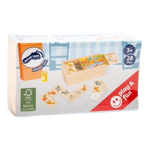 Nechť hra začne! Toto domino je vyrobeno ze 100% certifikovaného FSC® dřeva. Velké kostky se zvířaty safari. Dílky lze jednoduše uložit do dřevěného boxu. Hlavní vlastnosti: rozvíjí jemnou motoriku dětípodporuje logické myšlenívyrobeno ze 100% FSC dřeva Značka a certifikát FSC® (Forest Stewardship Council) zaručuje, že dřevo, ze kterého byl produkt vyroben, nebylo vytěženo nelegálně a pochází z lesů obhospodařovaných šetrným či přírodě blízkým způsobem, ve kterém jsou dodržovány přísné environmentální a sociální požadavky. Značka FSC® na výrobku znamená, že svým nákupem pomáháte chránit lesy a podporujete šetrné, odpovědné či přírodě blízké hospodaření, díky kterému jsou naše lesy stabilnější, zdravější, mají přirozenou druhovou skladbu a lépe odolávají negativním následkům klimatických změn.