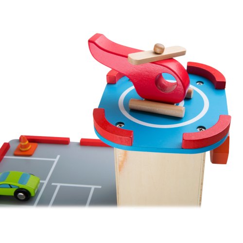 Zábava na třech podlažích! Výtah vyveze auta do požadovaného patra, heliport má dost místa pro hladké přistání helikoptéry, v přízemí mohou auta natankovat. Množství značek pomáhá s řízením dopravy. Součástí jsou 2 auta, vrtulník, 4 dopravní značky a 3 dopravní kužely, benzínová pumpa a závora. Od teď bude v dětském pokoji opravdu velký provoz. Hlavní vlastnosti: 3 podlaží propojená funkčním výtahem a 2 rampami12 ks příslušenstvíodolné dřevěné provedení