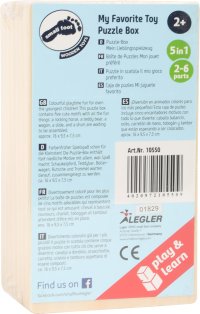 Obrysové puzzle s motivy oblíbených dětských hraček pro nejmenší děti! Puzzle jsou baleny v dřevěné krabičce s vysouvacím víčkem, na kterém jsou znázorněny jednotlivé hračky. Balení obsahuje celkem pět puzzle obrázků s různým počtem dílků. Dílky jsou robustní a tedy vhodné pro malé prstíky a první skládání. Skládání podporuje rozvoj fantazie a má příznivý vliv na jemnou motoriku. Vhodné pro děti od 2 let.