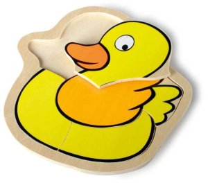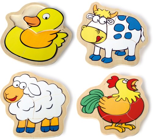 Balení obsahuje 4 odlišné puzzle motivy (4 dílky kačenka, 5 dílků kravička, ovečka a kohout). Dřevěná podložka usnadňuje přenášení a rámeček zabezpečuje, aby dřevěné dílky držely na svém místě. Baleno v dřevěné krabičce s průhledným víkem.