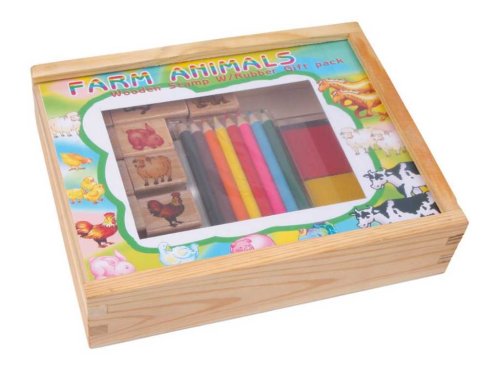Zvířecí obyvatele farmy se zde pomocí 9 razítek a 2 inkoustovými polštářky octnou na papíře. S 8 pastelkami si mohou děti motivy barevně vymalovat. V dřevěné krabici je dodatečně místo na další potřeby. Hlavní vlastnosti: rozvíjí představivost a logické myšlení dětírozvíjí jemnou motorikupraktické balení