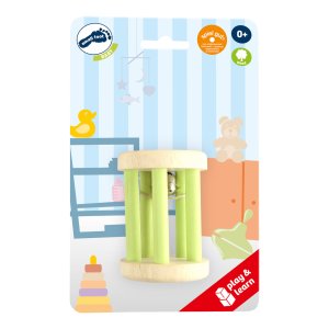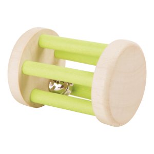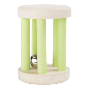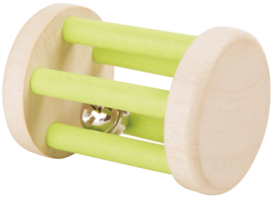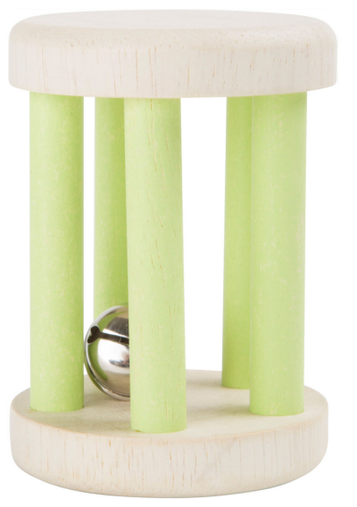 Dřevěné zvukové chrastítko s rolničkou ve tvaru válce.