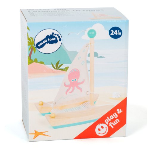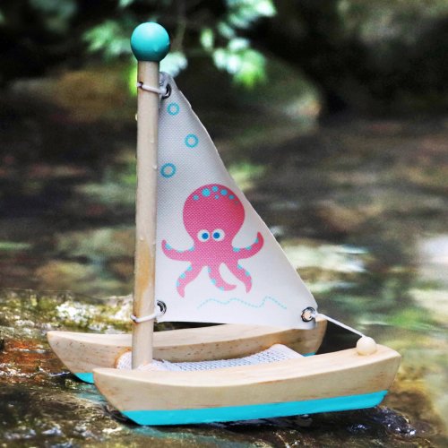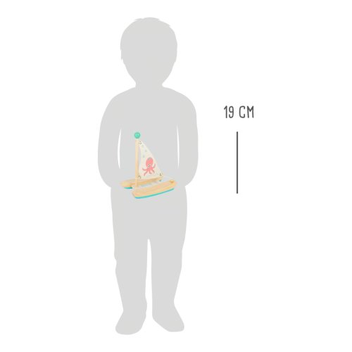 Dřevěná loďka pro všechny malé námořníky. Hračka je vyrobena z kvalitního dřeva a barvena v pastelových tónech. Na plachtě má loď vyobrazenou chobotnici. Rozměry katamaránu jsou cca 16 x 12 x 19 cm. Vhodné pro děti od 2 let.