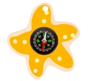Funkční kompas usazený v dřevěné hvězdici. Rozměry hračky jsou cca 10 x 10 x 1 cm. Vhodné pro děti od 18 měsíců.