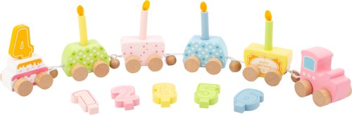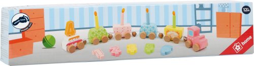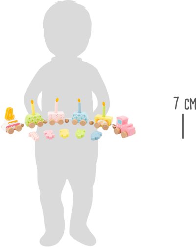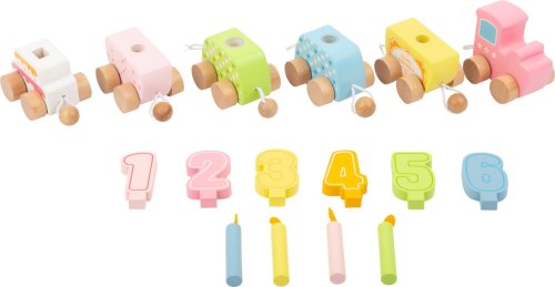 Další zastávka - oslava narozenin! Krásný dřevěný vláček v pastelových barvách je to pravé pro každého oslavence. Vláček obsahuje: lokomotivu, 5 vagónků, číslice 1-6 a dřevěné svíčky Vhodné pro děti od 12 měsíců.