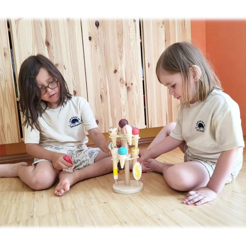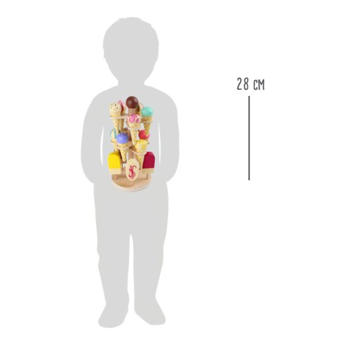 Z takové nabídky zmrzliny si vybere každý! S pomocí stojanu s mraženými sladkostmi mohou děti rozvíjet fantazii, poznávací a komunikační dovednosti. Podělí se s přáteli a rodiči? Nebo budou chtít zmrzlinu prodávat? Pak lze soupravou zpestřit některý z bohaté nabídky stánků a obchodů, nebo ji doplnit o jejich příslušenství, například pokladnu. Svou barevností zpestří každý dětský pokojíček. Zmrzliny v kornoutech lze vkládat do kruhových otvorů, které lze rozvinout kolem ústředního sloupku stojanu. Do děr v jeho podstavci lze pak usadit i rozmanité nanuky. Pro snadné přenášení je stojan na vrcholu opatřen robustní koulí. Všechny součásti jsou vyrobeny z kombinace masivního dřeva a silné překližky, hračka tak může nabídnout vysokou odolnost a životnost. Hlavní vlastnosti: 3 patrový stojan s 10 zmrzlinami a 5 nanukyvhodný doplněk stánků a obchodůsnadno přenosnýodolné dřevěné provedení