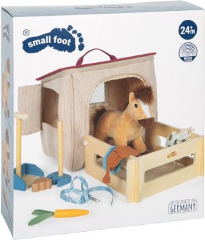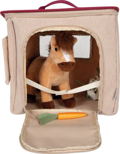 Nasedat a hrajeme si! Tento nádherně zpracovaný set s tématem koní a ježdění má vše, co malí milovníci koní potřebují ke štěstí! Hlavní roli hraje roztomilý plyšový koník, který bydlí v pevné manšestrové tašce. A teď pozor! Díky zipům se taška během chvilky promění ve stáje a zároveň slouží jako praktické úložiště pro všechno příslušenství! Ohrádku s připevněním na suchý zip můžete sestavit před stájemi, nebo ji uzavřít do kruhu jako výběh, hra tak působí opravdu realisticky. Součástí setu je: sedlo, dečka a uzdečka,mrkvička a síť na seno pro krmení a dokonce i "mistička na bobky" s hráběmi, lopatkou a dřevěnými koblížky. Sen každého malého milovníka koní: detailní hrací set, který spojuje kreativní hraní s realistickými prvky. Připravený ke hře hned po vybalení, ideální i na cesty! Hlavní vlastnosti: celá herní sada v tašcepodpoří dětskou fantaziipodporuje jemnou motoriku včetně doplňků a příslušenství