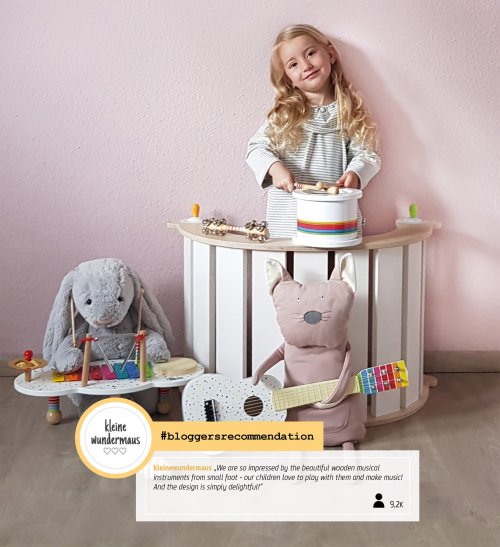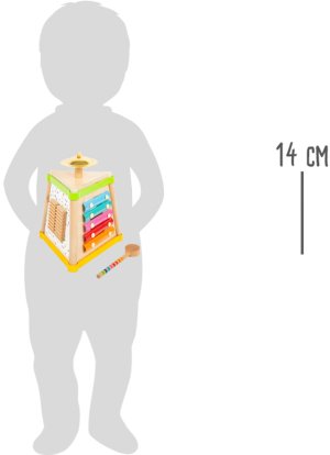 Hudba a tóny Vás zaručeně rozveselí! Tento pestrobarevný dřevěný komolý jehlan nabídne na svých třech stranách různé možnosti tvoření rytmických zvuků. Je zde chrastítko, mini xylofon a bubínek. Malý činel na vrcholku se rozezvučí zvonivým zvukem. Všestranná zvuková sada dává hudební show zelenou! Nejedná se o hudební nástroj, ale o hračku. Hlavní vlastnosti: 4 zvukové nástroje a paličkatrénuje sluch, jemnou motoriku a smysl pro rytmus