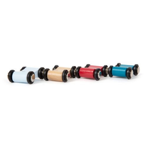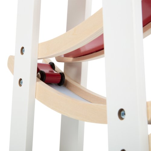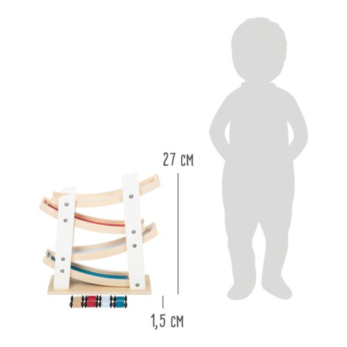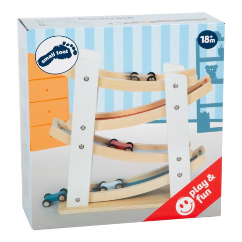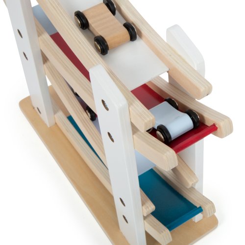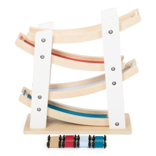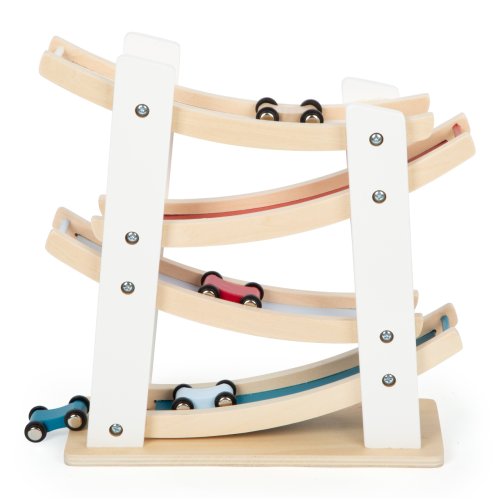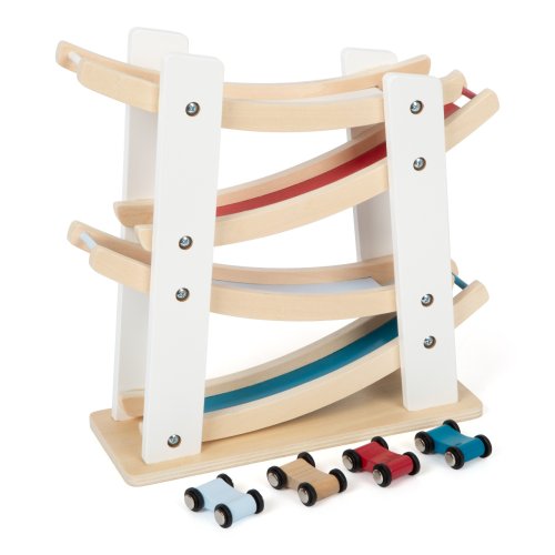 Na značky, připravit, start! Tato dřevěná kaskádová závodní dráha nabízí prostor pro změření rychlosti 4 autíček. Z jednoho patra na druhé, autíčka dělají přemety a jen koukat na ně je zábavné. Dráha je vyrobena z přírodního a bílého dřeva, jedno autíčko je přírodní, zbylé 3 jsou barevné. Hračka rozvíjí motoriku dětí, také koordinaci ruka-oko. Hlavní vlastnosti Přírodní dřevo s barevnými detailyOboustranná autíčka s pogumovanými kolyRozvíjí motoriku a koordinaci ruka-oko