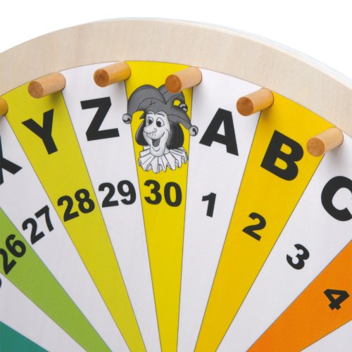 Toto kolo štěstí je skvělým doplňkem pro hry jako např. loterie, slovní hry nebo vymyšlené hry s figurkami od 1 do 30, písmeny od A do Z a také 4 žolíky.