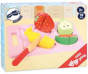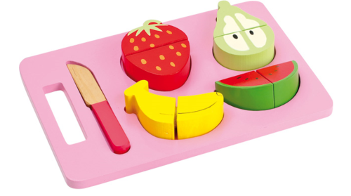 Máš v kuchyni vše připraveno k podávání zdravé svačinky? Ovoce je umyté? Zbývá je už jen nakrájet. Přichystej si prkénko a nůž a můžeš začít - banán, jahoda, hruška a meloun. Součástí balení je prkénko, dřevěný nůž a 4 druhy ovoce, které děti mohou krájet na polovinu. Ovoce drží v celku pomocí suchého zipu. Vhodné pro děti od 3 let.