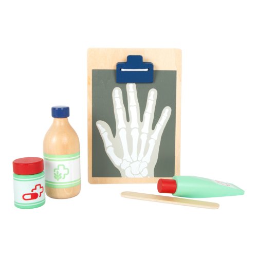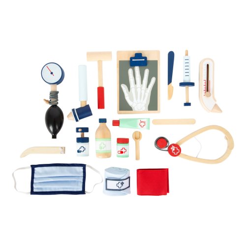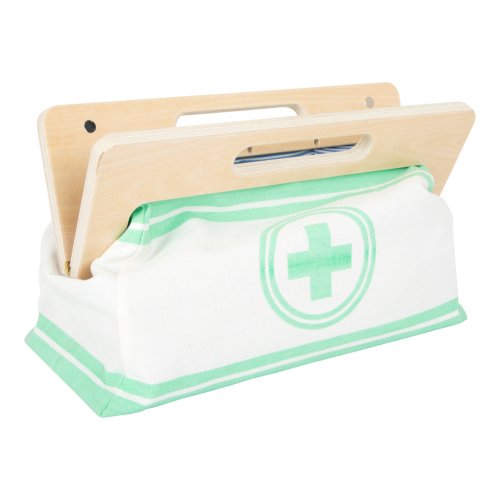 S touto standardní lékařskou brašnou budou mladí nadějní lékaři perfektně vybaveni. Brašna je vyrobená z měkkého textilu, je pěkná na pohled a také velmi funkční. Lze lehce otevřít díky magnetům, je vyrobena ze dřeva. Uvnitř brašny najdete všechno vybavení pro představivé ošetření pacientů: stetoskop, teploměr, stříkačku a mnoho dalšího – vše vyrobeno z pevného dřeva! Nejlepšími doplňky jsou zřejmě tlakoměr s manžetou a balónkem a otoskop s lupou. Tento obsáhlý set lékařských hraček obsahuje mnoho „opravdových“ lékařských nástrojů a přístrojů, s kterými si děti opravdu vyhrají. Ilustrace na lékařských pomůckách dětem poradí rozeznat nástroje a také jim možná zjednoduší jejich použití. Hlavní vlastnosti: Doktorská brašna s jasně viditelným dřevemTlakoměr s manžetou a balónkemTeploměr s nastavitelnou teplotouOtoskop s opravdovou lupouLahvička na léky se šroubovatelným víčkemNáplasti na suchý zipZnovu použitelné a pratelné dětské textilní rouškyDalší vybavení: injekční stříkačka s pohyblivým mechanismem, stetoskop, dezinfekce s pumpičkou, lahvička s léky a lžička, pinzeta, skalpel, reflexní kladivo