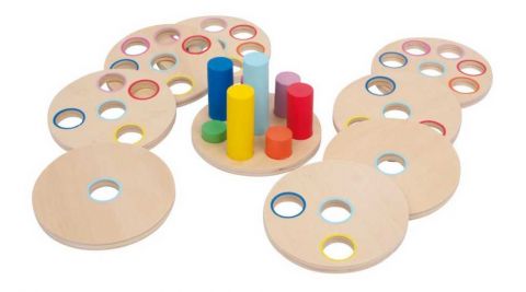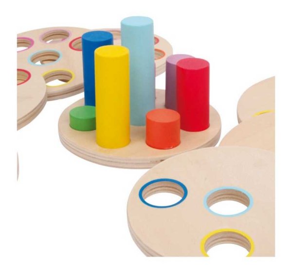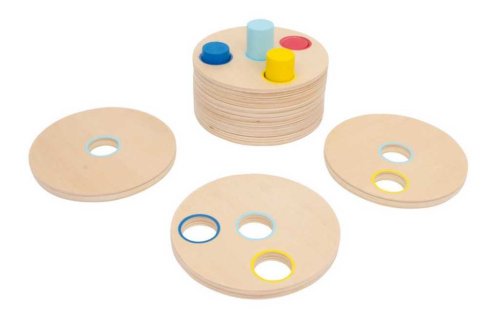 Dobře si prohlédni, přemýšlej, zkoušej a vhodně nasaď – skvělá nasouvací hra pro trénování motoriky, koordinace ruky a oka. Pevné kotouče (tloušťka 1 cm) z jemně broušené překližky mají být nasunuty na barevné tyče. Tyče jsou různých délek a každý disk má vždy o jeden otvor méně než předchozí, skládání přirozeně vede k jedinému řešení. Barevné kruhy na discích usnadňují hraní, můžou se však otočit tak, aby barvy nebyly viditelné a hra se stává náročnější. Hlavní vlastnosti: obsahuje 9 dílů (8 kotoučů a stojan)kvalitní provedenípodporuje rozvoj logického myšlení